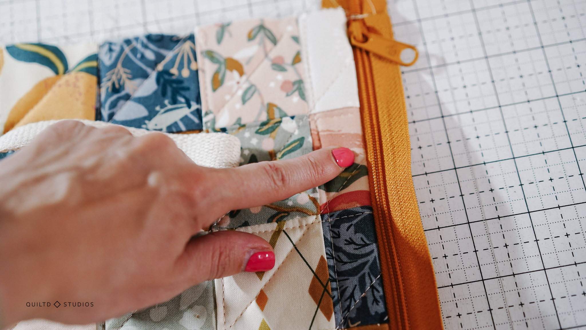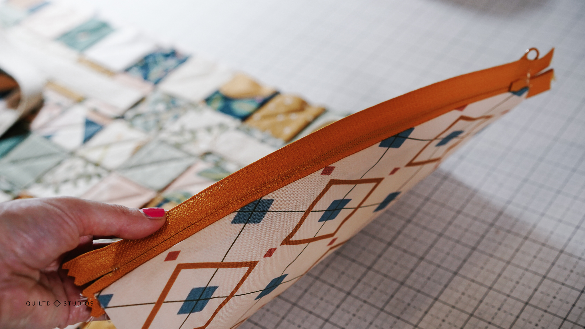 Center the zipper right side down along the top long edge of one side of the patchwork panel.