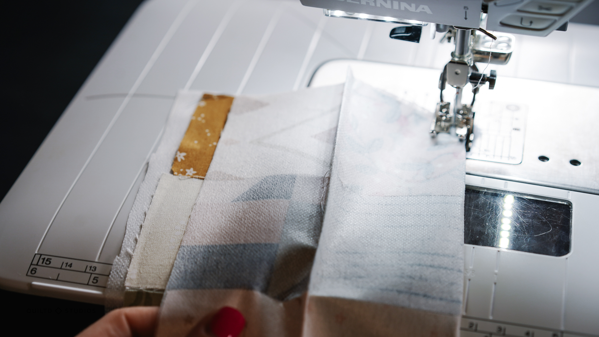 Using the edge of the squares as a guide and sew using a scant 1/4" seam allowance (if using a full 1/4" seam, your panels and squares will be a little smaller, which is fine but keep that in mind).
